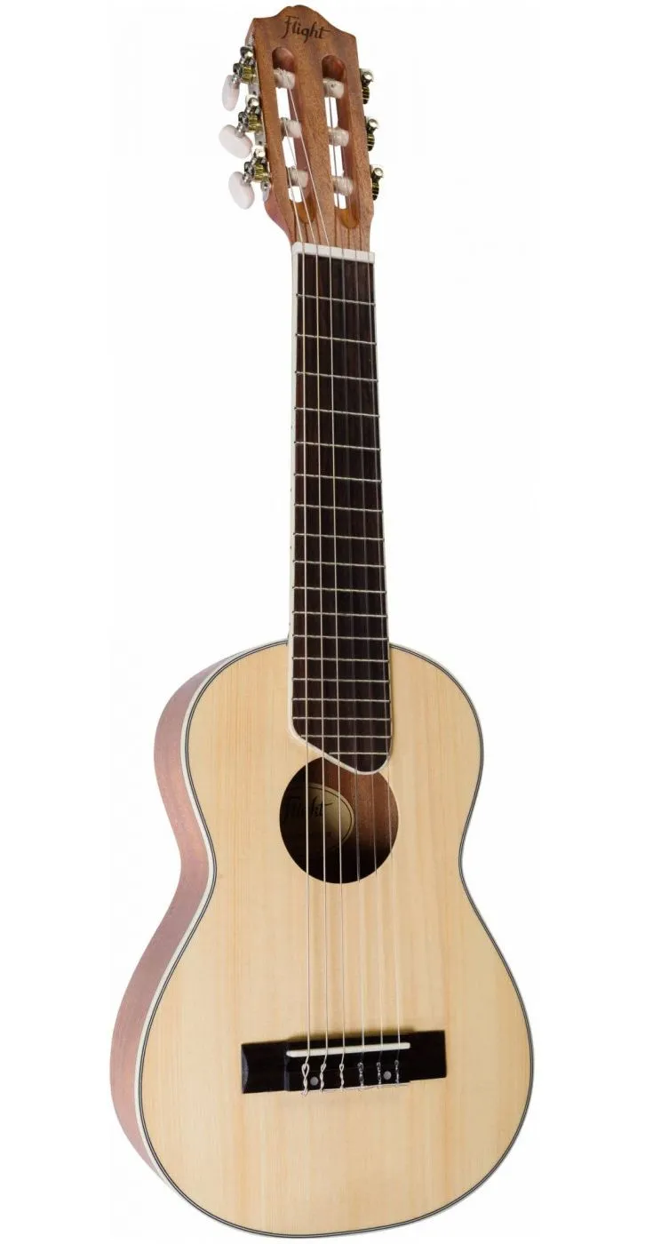 Гиталеле Flight GUT 350 SP/SAP - гиталеле - гитара 1/8 малого размера (432 мм) с нейлоновыми струнами. Несмотря на компактный размер, по игровым характеристикам и качеству производства она не уступает полноразмерным инструментам. Верхняя дека выполнена из ели, нижняя дека и обечайка из сапеле.