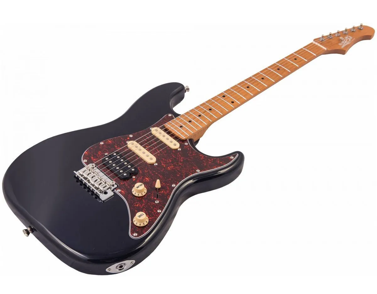 У инструментов JS-400 профиль грифа - Modern C. Это наиболее распространенный современный профиль грифа, у таких грифов удобный овальный профиль, который подходит для большинства стилей игры. Гриф и накладка на гриф выполнены из печеного клена (roasted maple). При такой обработке поры дерева максимально сжимаются и в процессе использования вода уже не будет выходить, ваша накладка не сожмется и лады не повылазят вне зависимости от влажности и смены температуры. Плюс такое дерево выглядит очень красиво.     Колки: хром     Материал грифа: канадский печеный клен     Профиль грифа: Modern C     Накладка на гриф: печеный клен     Радиус: 9,5"     Ширина верхнего порожка: 41,91 мм (1,65")     Порожек: PPS     Анкерный стержень двойного действия     Мензура: 647,7 мм (25,5")     Количество ладов: 22     Материал корпуса: тополь запеченный     Звукосниматели: HSS Ceramic     Бридж: Tremolo     Управление: 1V, 1T, 5-ти позиционный переключатель     Фурнитура: хром     Цвет: Black / черный